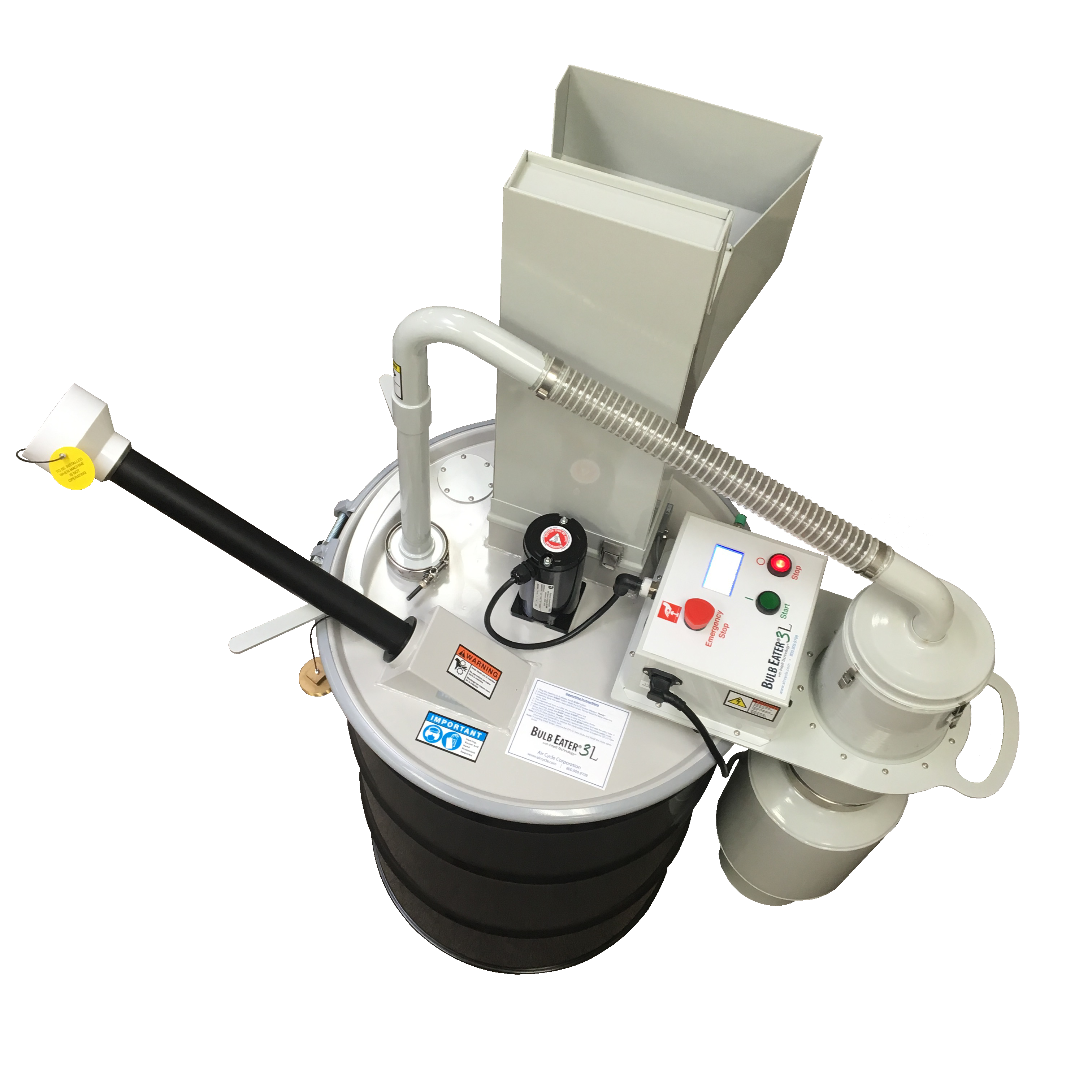 By law, non-residential fluorescent light bulbs must be disposed of in a special manner. These fluorescent bulb crusher meet the EPA and OSHA standards for bulb crushing and disposal. The toxic mercury vapor in the bulbs is captured in the filtration system. Fit up to 1,350 crushed four foot T8 bulbs into one 55 gallon drum. Ideal for factories, hospitals, schools, universities, office buildings, malls, and airports.